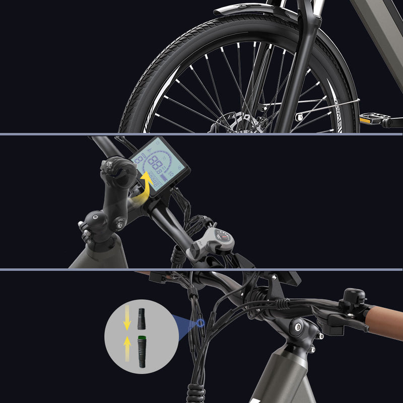 Conception conviviale : Les pneus urbains minces 26×1,75 offrent adhérence et durabilité, une tige de guidon réglable s'adapte aux cyclistes de différentes tailles, et le câblage plug-and-play facilite l'entretien.